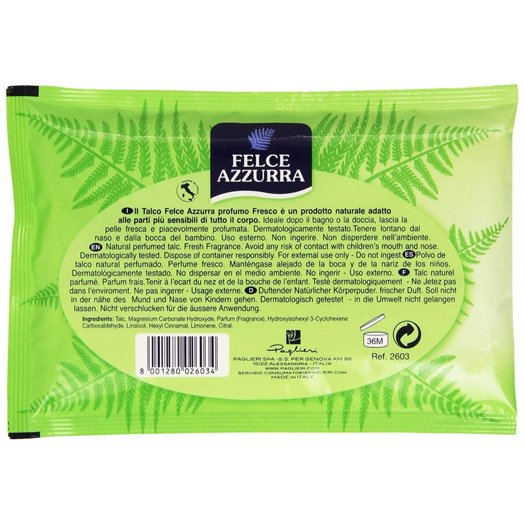 Estendi la ricerca a: talco e prodotti prima infanzia, igiene e cura della persona, felce azzurra, borotalco, paglieri, felce, azzurra, talco, busta, da, 100, grammi, fresco