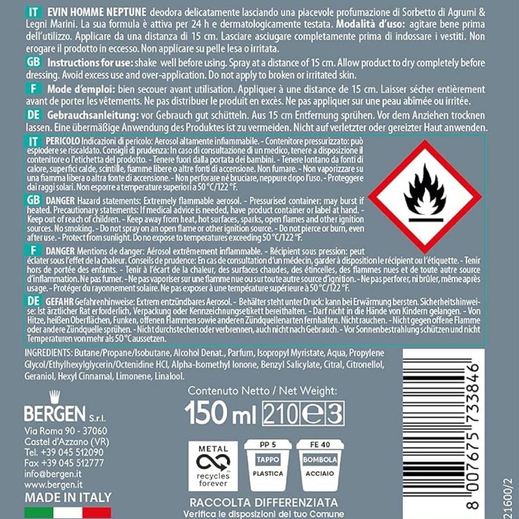 Evin Deodorante Spray Uomo 150ml - Neptune Sorbetto Di Agrumi E Legni Marini