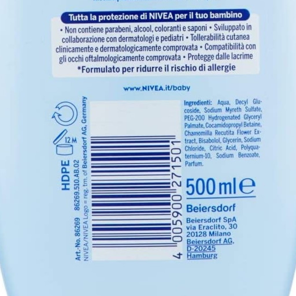 Estendi la ricerca a: talco e prodotti prima infanzia, igiene e cura della persona, nivea, baby, shampoo, per, bambini, 500ml, dolci, carezze