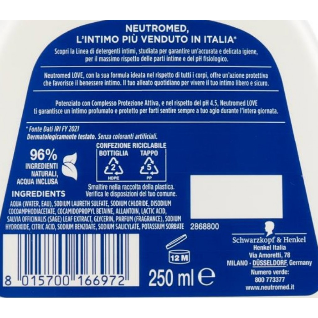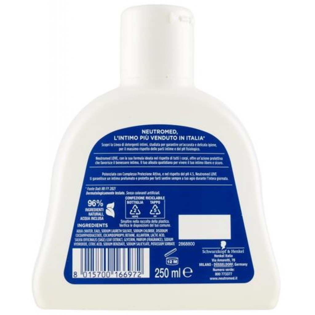 Estendi la ricerca a: detergenti intimi e salviettine intime, igiene e cura della persona, neutromed, detergente, intimo, 250ml, love, ph, 5, azione, protettiva