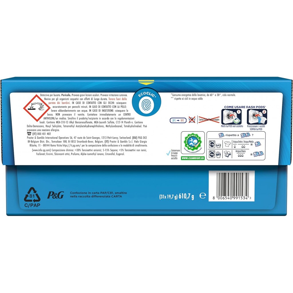 Estendi la ricerca a: detersivi lavatrice ecodosi o tabs, prodotti per bucato e tessuti, capi, colorati, dash, pods, detersivo, lavatrice, in, caps, 31, pezzi, colore