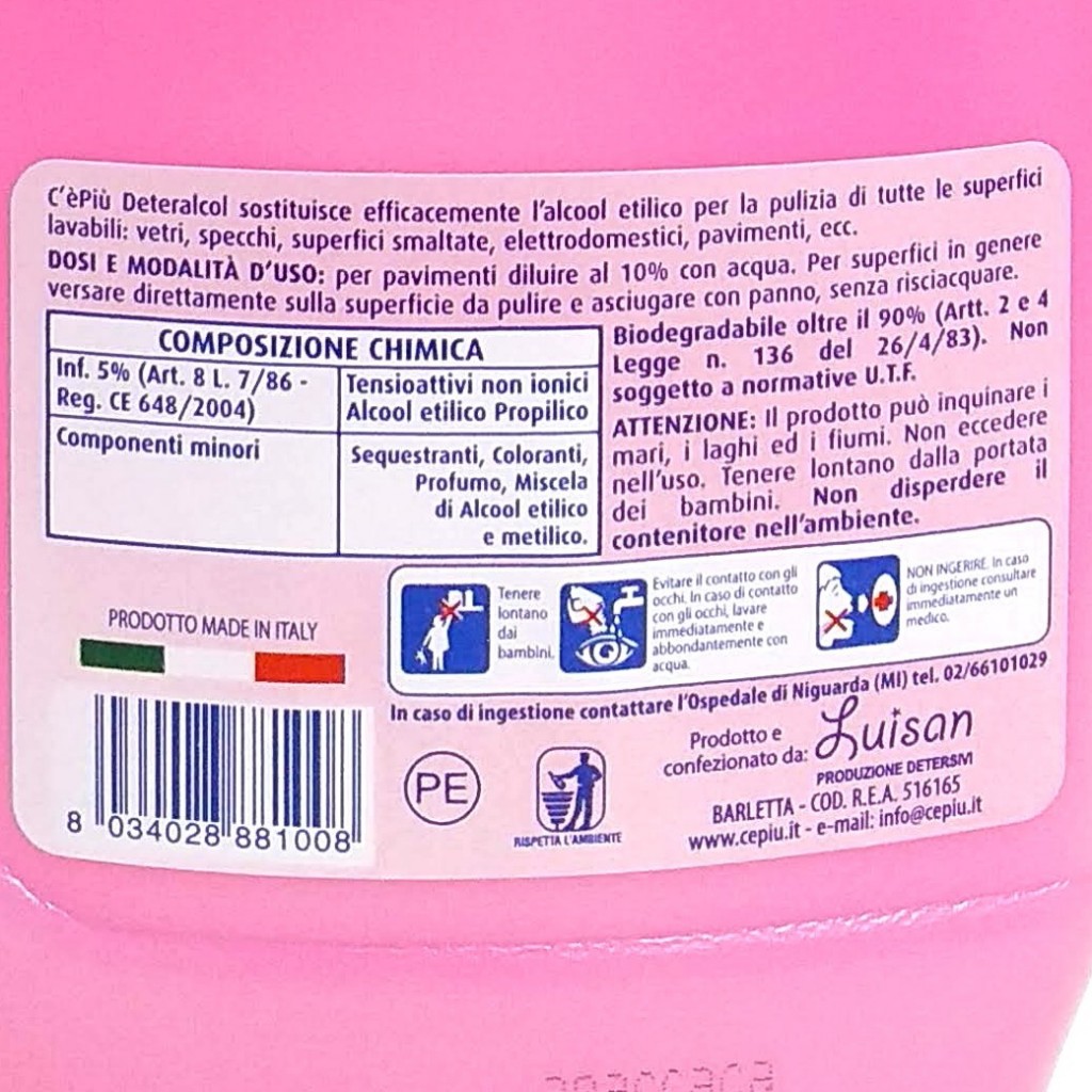 Estendi la ricerca a: alcool etilico e per pulizie, pulizia e cura della casa, denaturato, ce', piu', deteralcol, prufumato, litro, sostituisce, l'acool, etilico