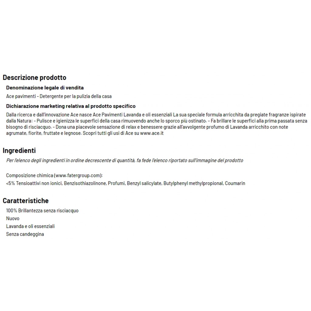 Estendi la ricerca a: detergenti pavimenti e superfici, pulizia e cura della casa, ace, pavimenti, igienizzante, litro, lavanda, olii, essenziali