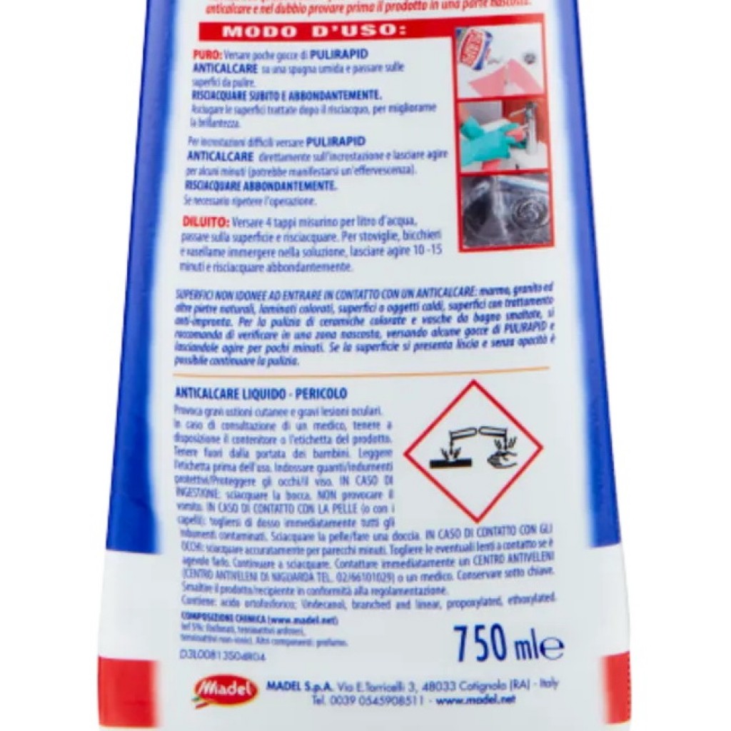 Estendi la ricerca a: detergenti bagno - cucina - metalli, pulizia e cura della casa, pulirapid, detergente, anticalcare, liquido, 750ml, classico