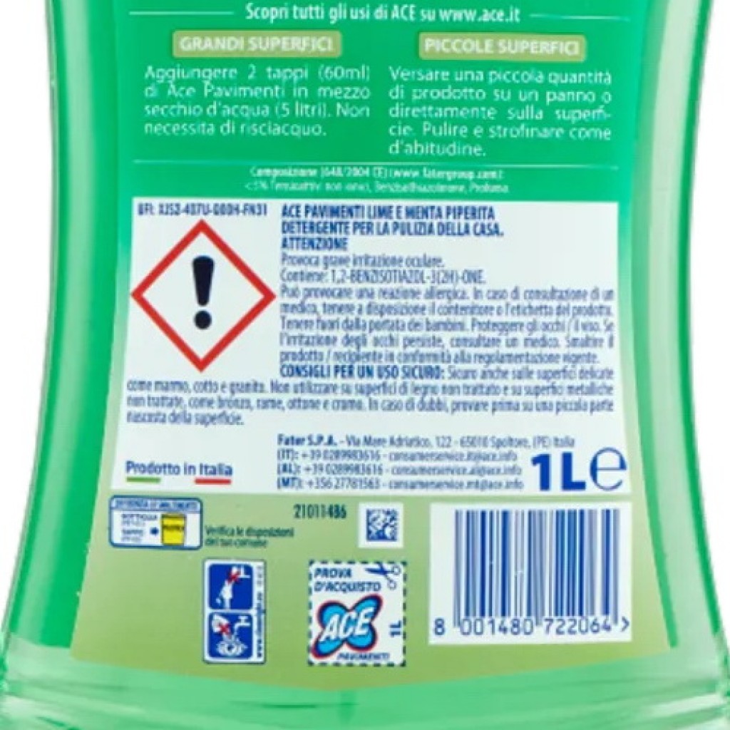 Estendi la ricerca a: detergenti pavimenti e superfici, pulizia e cura della casa, ace, pavimenti, igienizzante, litro, lime, menta