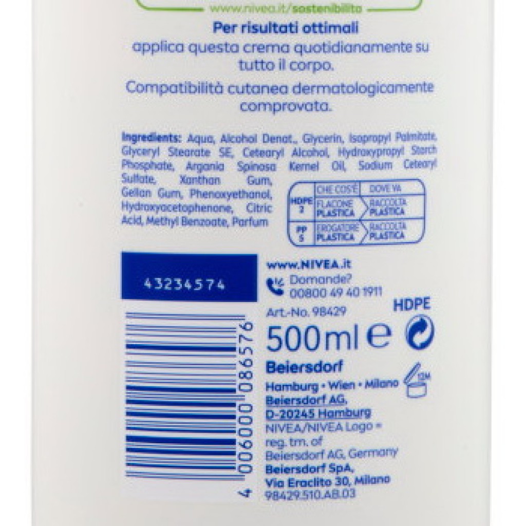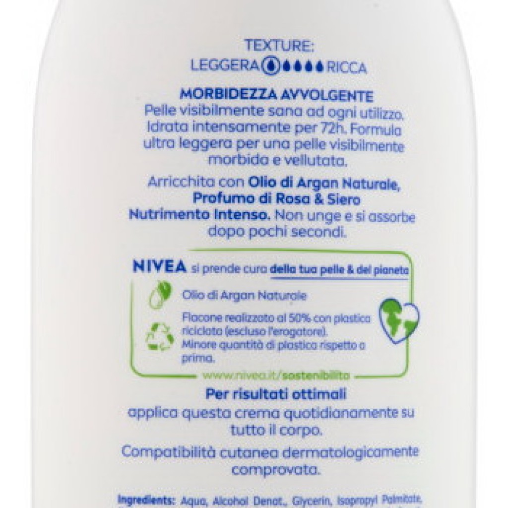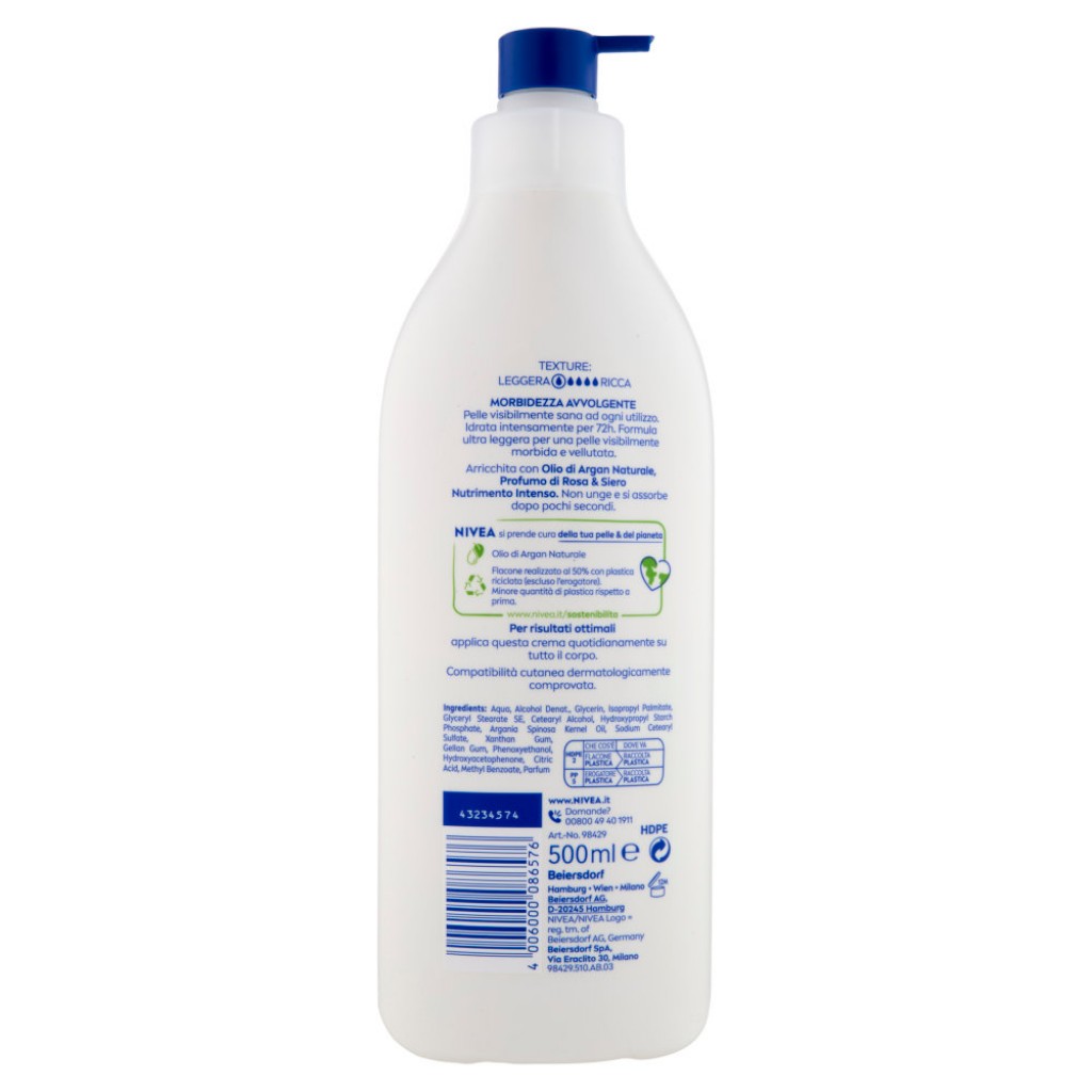 Estendi la ricerca a: creme mani e corpo, igiene e cura della persona, nivea, body, crema, fluida, corpo, 500ml, 72h, idratante, rosa, argan