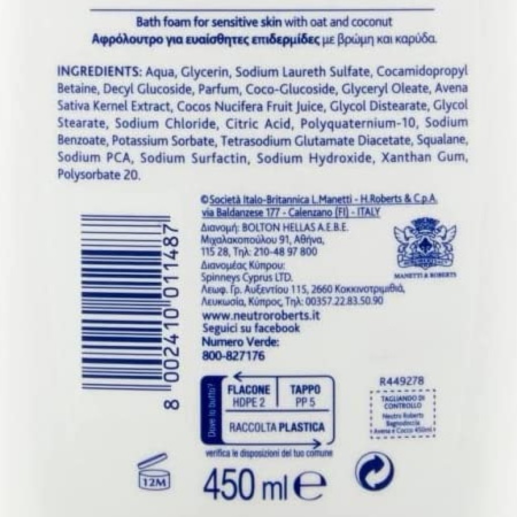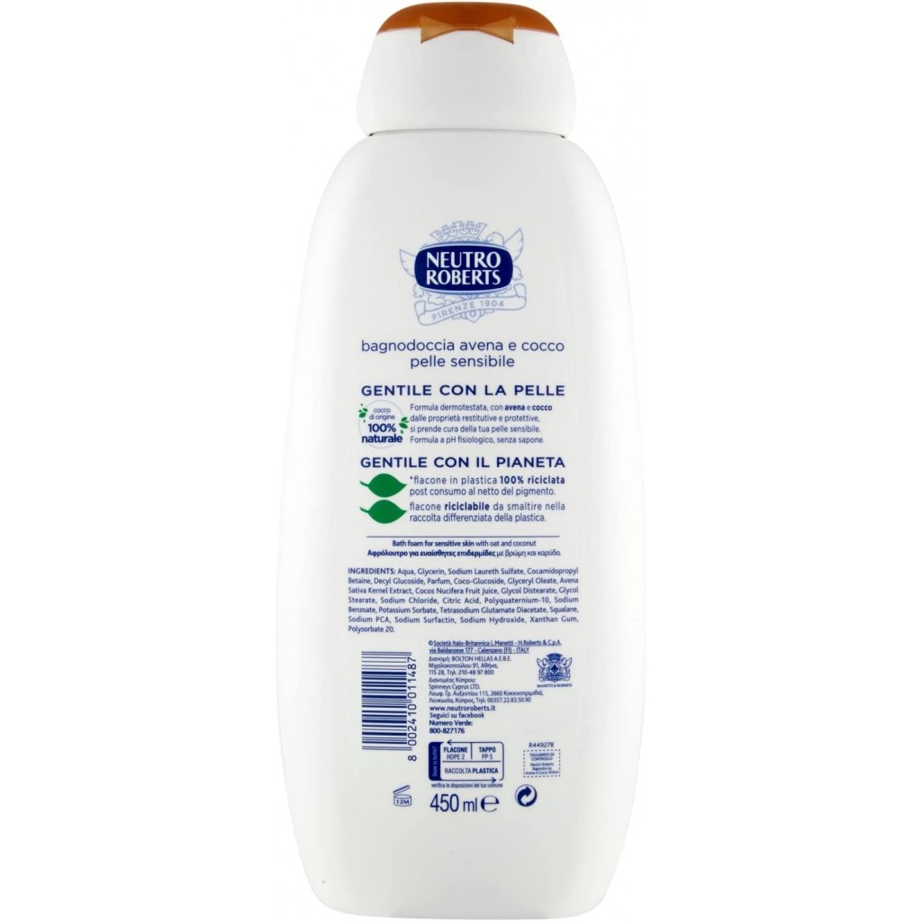 Neutro Roberts Bagnodoccia - 450ml - Pelle Sensibile Con Avena E Cocco