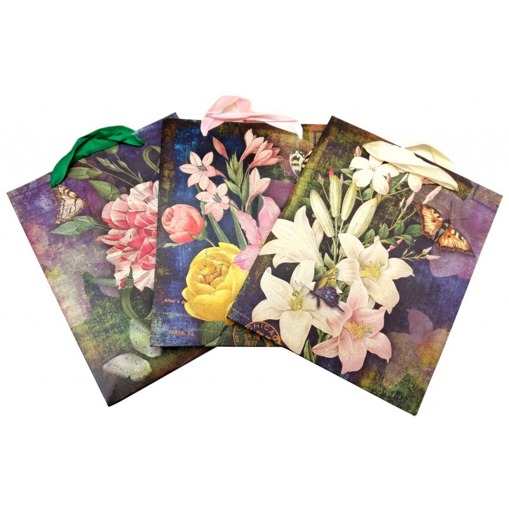 Busta Da Regalo In Carta 18x13x8cm - Decorazini Floreali Brillantinate Ass.